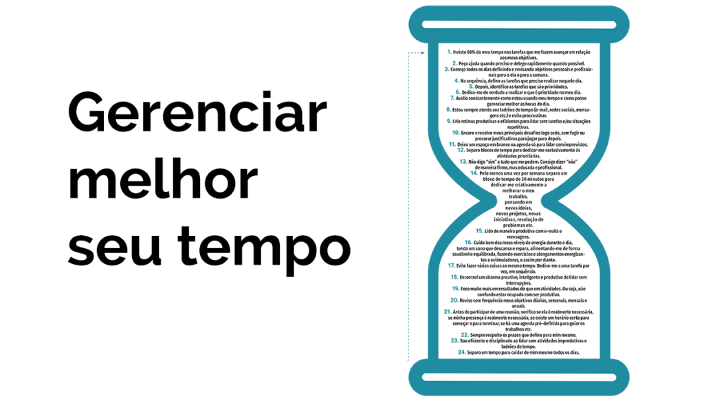 As afirmações abaixo são um bom ponto de partida para você criar um plano de ação para gerenciar melhor seu tempo. Use-as como sua aliada para melhorar sua produtividade dia após dia e, assim, ser também um gestor cada dia melhor.