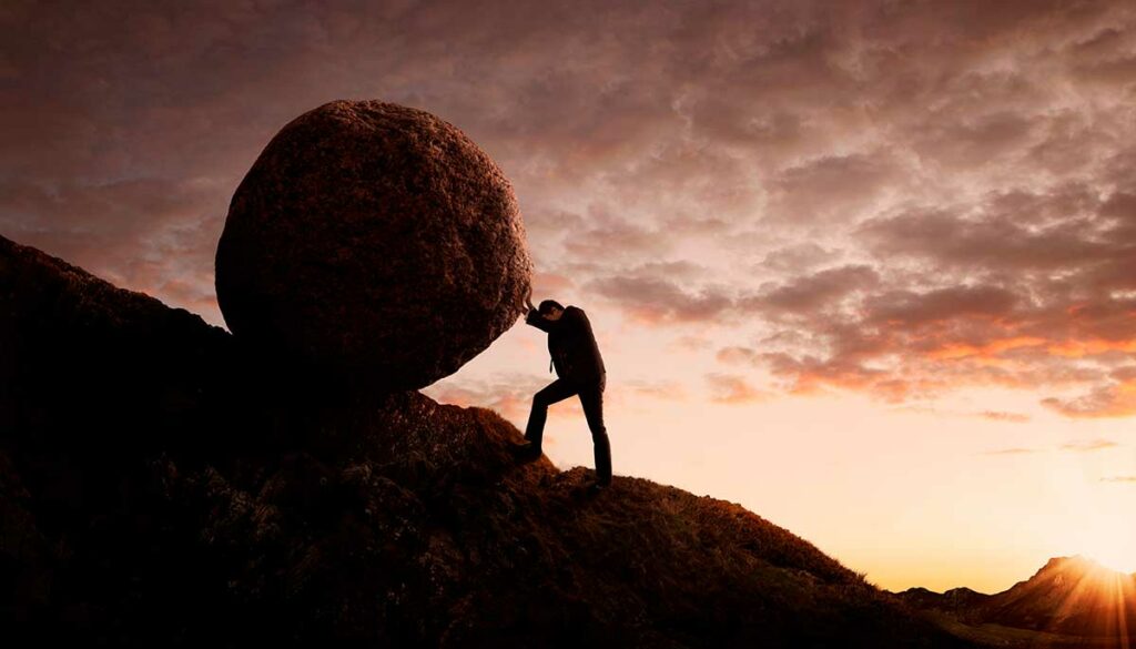 Ele passará a eternidade carregando a pedra morro acima, tentando (em vão) se libertar. Afinal, toda vez que chega ao topo, a pedra rola para o outro lado.